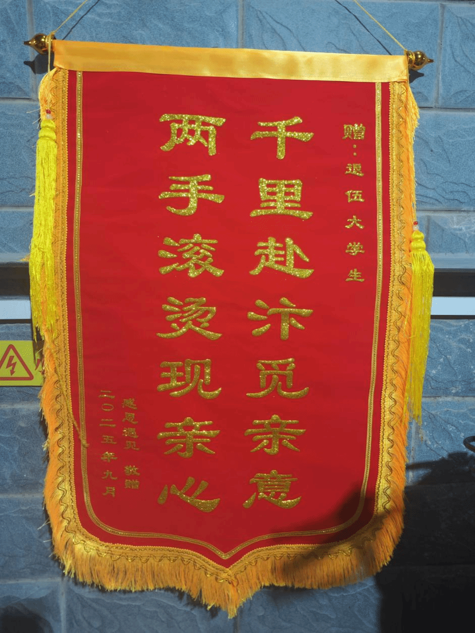 更让张先生动容的是,席晟杰悄悄记下他对炒凉粉的惦念,趁其与家人回忆过往的间隙,专程买来两份热腾腾的炒凉粉。这份突如其来的温暖,让张先生眼眶泛红。分别时,张先生多次追问联系方式,席晟杰始终不愿透露,在对方再三坚持下,才留下了战友的电话。为表谢意,张先生特意定制锦旗,从新疆寄往开封。
