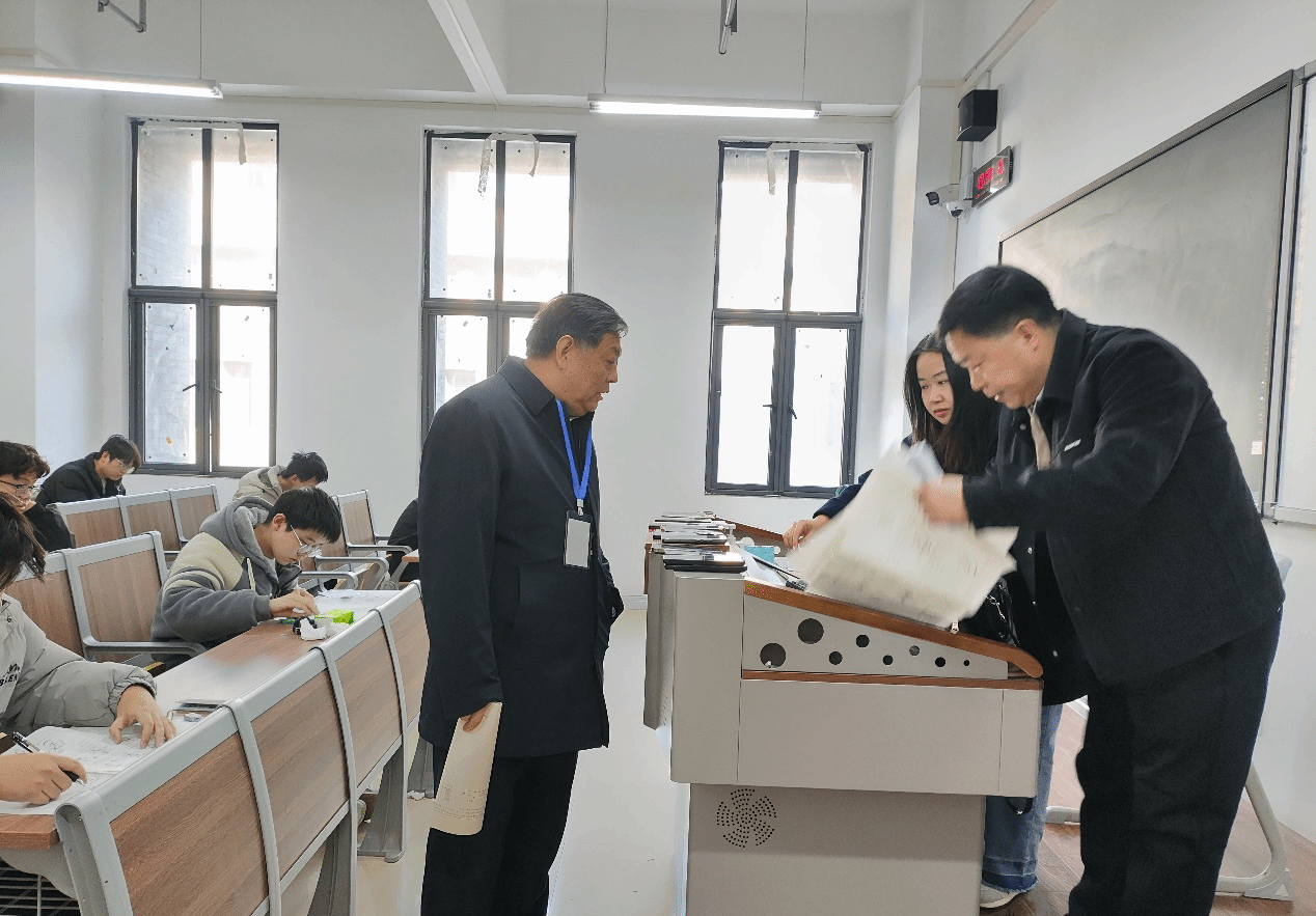 颉潭成一行对考试秩序、考场设施环境、学生考试纪律、监考教师履职情况等有关工作进行了全面检查,同时深入考场认真查看了试卷命题、学生答题、教师监考等情况,并与教务处及学院相关人员就考试情况进行了沟通交流。