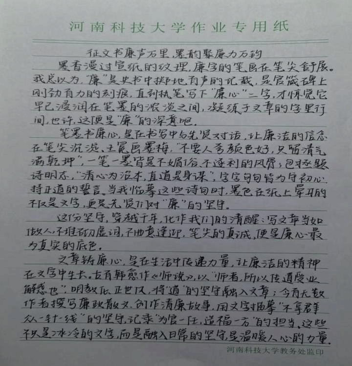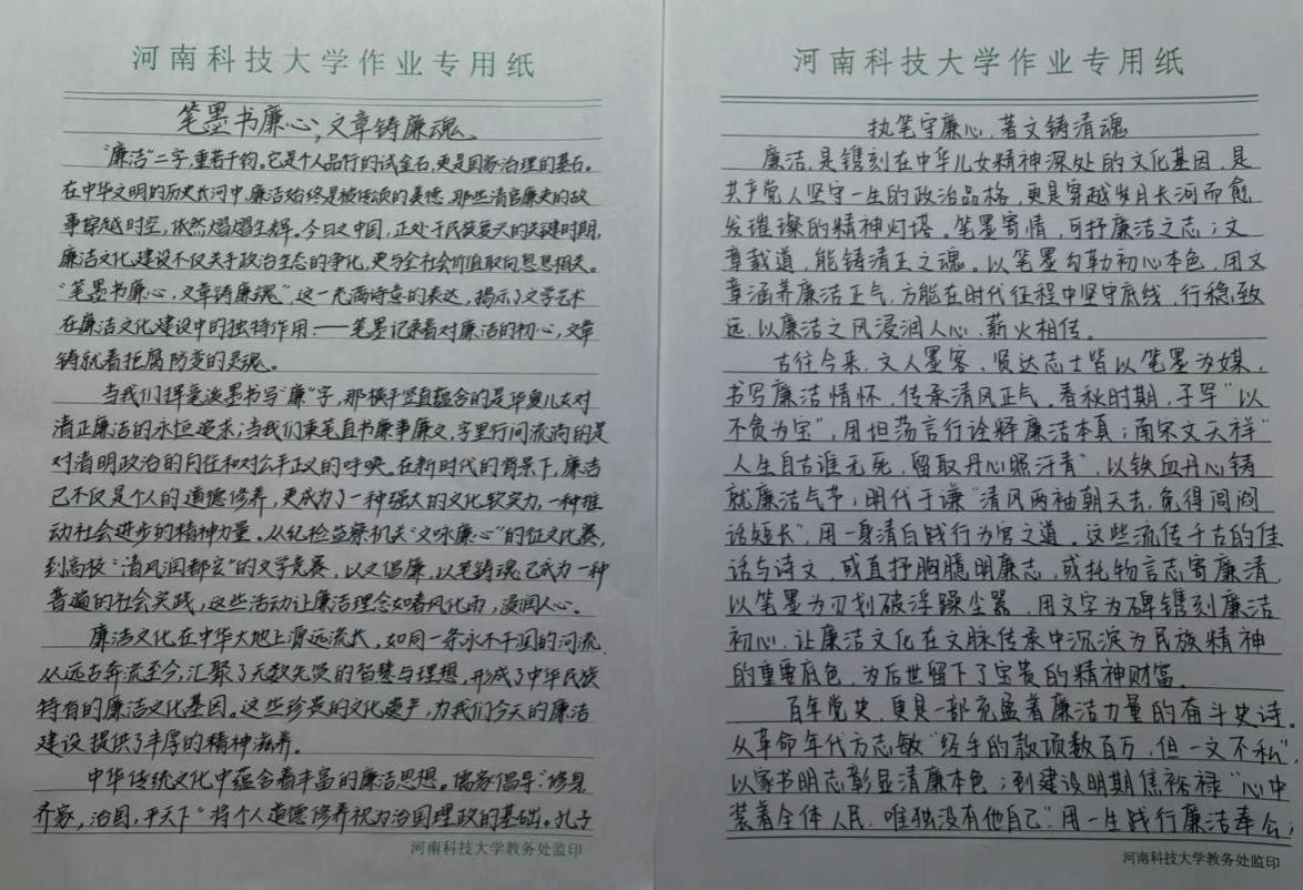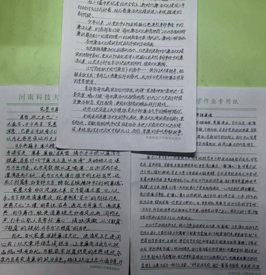 为贯彻落实党建“三级联创”工作要求及“一站式”学生社区全员育人导师制精神,引导青年学子将崇廉尚洁的理念内化于心、外化于行,河南科技大学应用工程学院团委主持部于 9 月 24日成功举办“笔墨书廉心,文章铸廉魂”廉洁主题征文活动。
