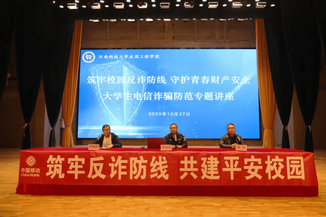 为贯彻落实校园安全部署,构建“全员参与、全程覆盖、全方位防护”的反诈安全体系,10月27日,应用工程学院在大学生活动中心开展反诈宣传活动,灵宝市公安局反诈中心大队长徐品第,灵宝移动公司副总经理陈涛,全体辅导员与2025级新生参加活动。